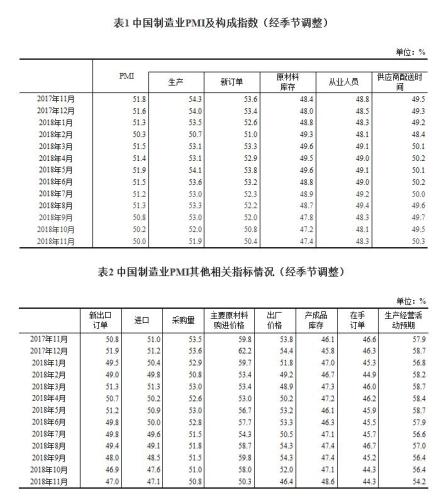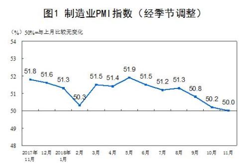 统计局今日公布2018年11月中国采购经理指数运行情况:2018年11月份,中国制造业采购经理指数(PMI)为50.0%,比上月小幅回落0.2个百分点,处于临界点。