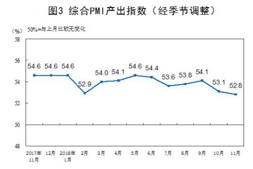 2018年11月份,综合PMI产出指数为52.8%,比上月回落0.3个百分点,表明我国企业生产经营活动继续保持扩张,但活跃度有所减弱。