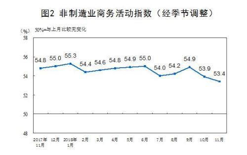 2018年11月份,中国非制造业商务活动指数为53.4%,比上月回落0.5个百分点,表明非制造业增长有所放缓,但仍在扩张区间。