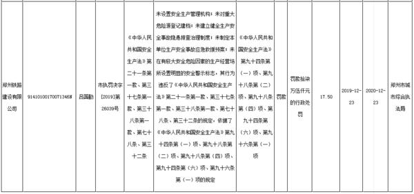罚单显示,郑州铁路建设有限公司因未设置安全生产管理机构;未对重大危险源登记建档,未建立健全生产安全事故隐患排查治理制度,未制定本单位生产安全事故应急救援预案,未在有较大安全危险因素的生产经营场所设置明显的安全警示标志,被罚款17.5万元,罚款金额最多。