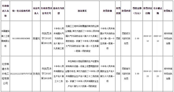 1月2日,记者从郑州市城市管理局获悉,最新一批行政处罚公示,中国建筑第二工程局有限公司、北京韩建水利水电工程有限公司、郑州铁路建设有限公司三家工程企业遭处罚,罚款金额共计22.5万余元。