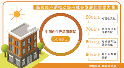 改革开放以来,我国民营经济不断发展壮大。当前,民营经济贡献了50%以上的税收,60%以上的国内生产总值,70%以上的技术创新成果,80%以上的城镇劳动就业,90%以上的企业数量,成为创业就业的主要领域、技术创新的重要主体、国家税收的重要来源,推动经济社会发展的重要力量。