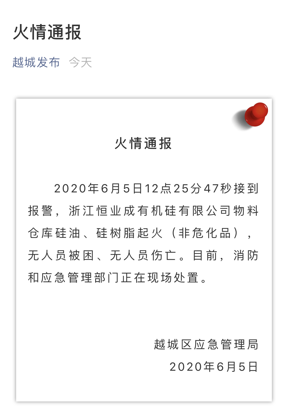 今天(5日)中午,浙江省绍兴市越城区启圣路和越秀路交叉口一家工厂突发火灾,现场浓烟滚滚,几公里外清晰可见。13时37分,越城区应急管理局发布通告称,2020年6月5日12点25分47秒接到报警,浙江恒业成有机硅有限公司物料仓库硅油、硅树脂起火(非危化品),无人员被困、无人员伤亡。目前,消防和应急管理部门正在现场处置。下午2点28分,记者从当地消防部门了解到,现场明火已全部扑灭。