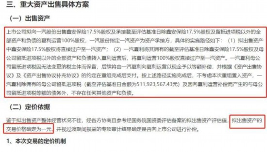 鉴于拟出售资产整体经营状况不佳,经各方协商且参考经国务院国资委评估备案的拟出售资产评估值,一汽夏利拟出售资产的交易价格确定为1元。
