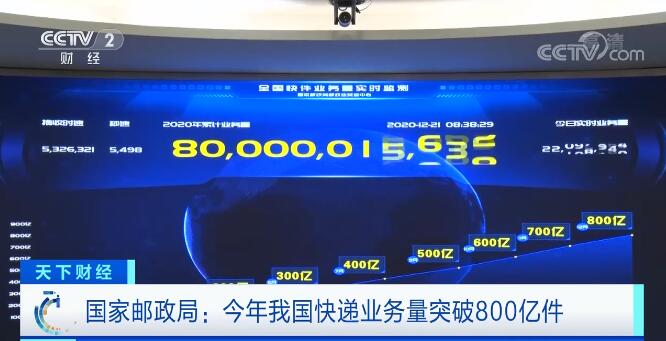 12月21日,国家邮政局发布消息,今年快递业务量超800亿件,日均3亿件已成常态,日均服务用户4亿多人次。从今年9月10日快递业务量达到500亿件开始,此后每月都登上一个百亿级台阶,实现了"四连跳"。今年,我国快递业务量增速经历了从负到正再到重回高位区间运行的转变。全国快递业务量1月份低位运行,首现负增长;2月份快速恢复,转为正增长。进入第二季度,随着复工复产复市持续推进,快递业务量增速明显加快,重回30%以上。 高效的寄送服务有效促进了电子商务发展,年支撑网上零售额超10万亿元,邮政快递业每年新增就业岗位20万人以上。