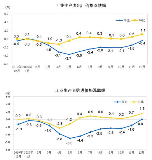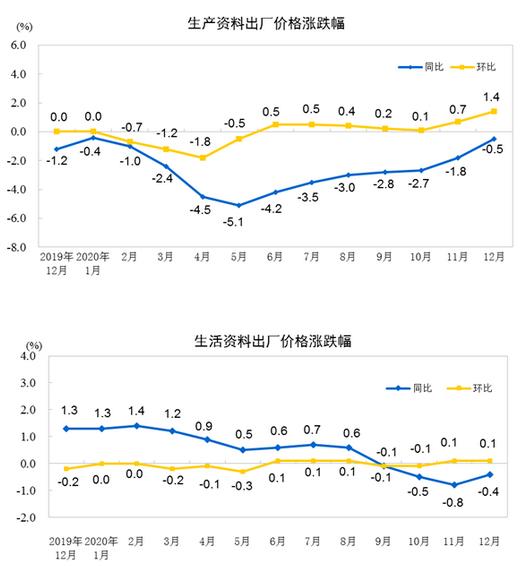 据国家统计局网站消息,2020年12月份,全国工业生产者出厂价格同比下降0.4%,环比上涨1.1%;工业生产者购进价格同比持平,环比上涨1.5%。2020年全年,工业生产者出厂价格比上年下降1.8%,工业生产者购进价格下降2.3%。